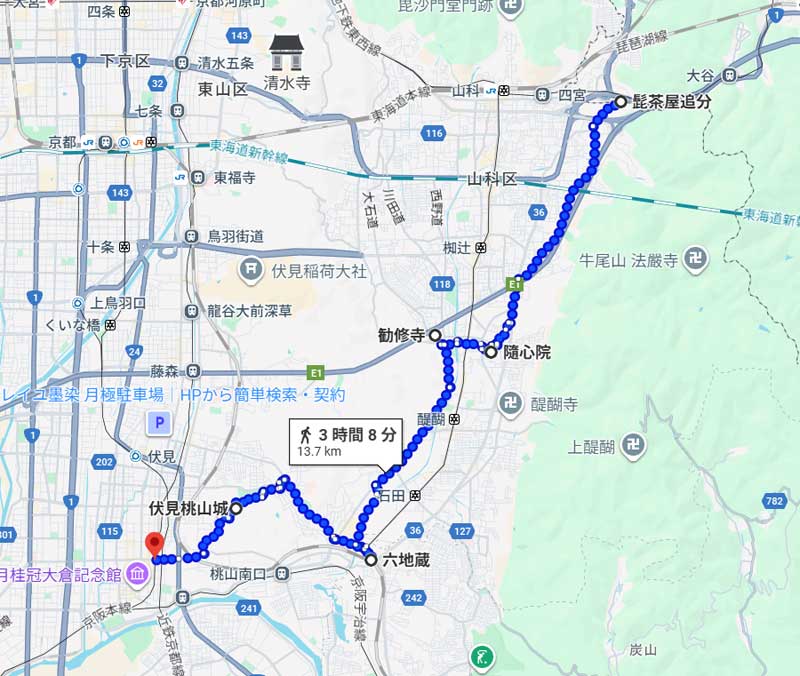 ・奈良街道ルート 追分白髭茶屋⇒隋心院⇒勸修寺⇒六地蔵⇒伏見桃山城⇒伏見(地図1)