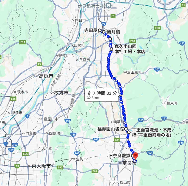 ・奈良街道ルート 観月橋⇒JR城陽・上狛⇒福寿園山城館⇒平重衡首塚⇒奈良監獄⇒東大寺(地図2)